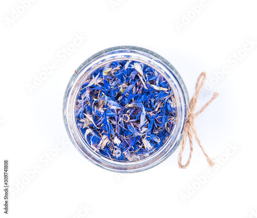 Blue cornflower centaurea dried petals in a glass jar isolated on white background.