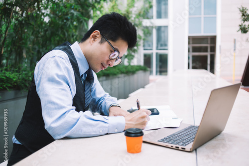 Asian manager filling papers at table