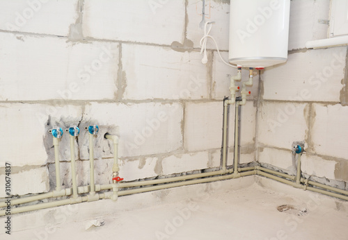 The concealed faucet with connected pipes is mounted in the wall and electric boiler.