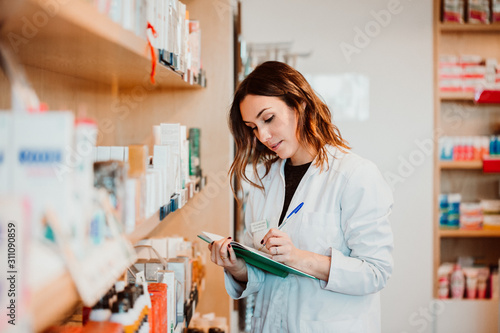 .Young female pharmacist working in her large pharmacy. Placing medications, taking inventory. Lifestyle