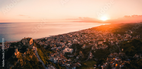 Roccella Jonica, vista aerea della città calabrese con il mare, la spiaggia e il castello. Panoramica.