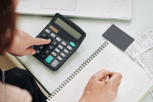 Close-up image of woman calculating expenses and incomes and writing in textbook, view from above