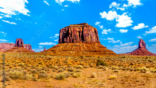The towering red sandstone formations of West Mitten Butte, Merrick Butte, East Mitten Buttes in Monument Valley Navajo Tribal Park desert landscape on the border of Arizona and Utah, United States