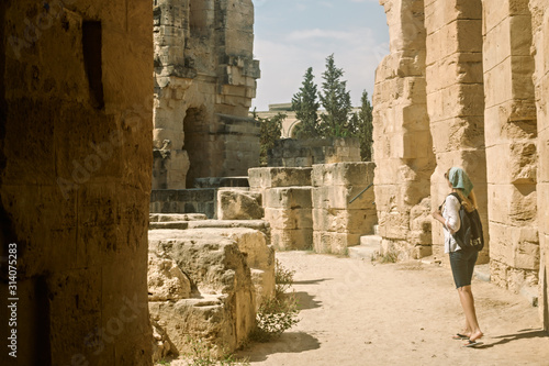 A girl inspects the ruins of the Roman amphitheater in El Jem, a UNESCO World Heritage Site