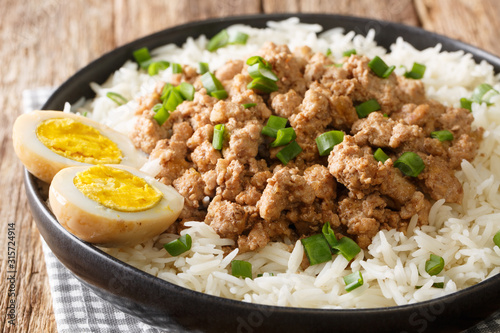 lu rou fan is a popular Taiwanese dish consisting of ground pork braised in soy sauce, five-spice powder, and rice wine served over rice close-up in a plate. horizontal