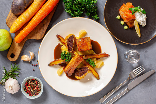 Trio wieprzowe - boczek wolno pieczony, żeberko glazurowane, kaszanka w panko - puree ziemniaczane, pieczony czosnek, mus jabłkowo-cydrowy, demi-glace, karmelizowana marchewka