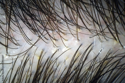 Scalp and hair with multiple exfoliation. Macroscopy of hair on the head with signs of peeling at hair follicles. Scalp dermoscopy. Hair treatment in the clinic.