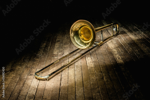 golden brass instrument trombone lies on a dark brown wooden stage in the rays of light.