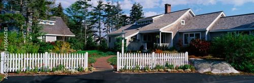 This is a lovely house with a typical suburban feeling. There is a white picket fence and a sidewalk leading up to the front door. The roof of the house slopes downward with trees in the background.