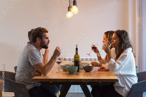 Joyful friends talking while drinking red wine. Friends having pleasant conversation during dinner. Communication concept
