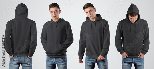 Mockup black blank hoodie on a young guy for design presentation.