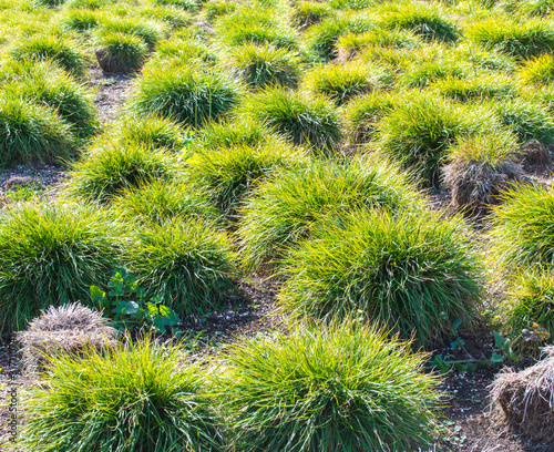 a field of bright green carex clumping grass on a sunny day