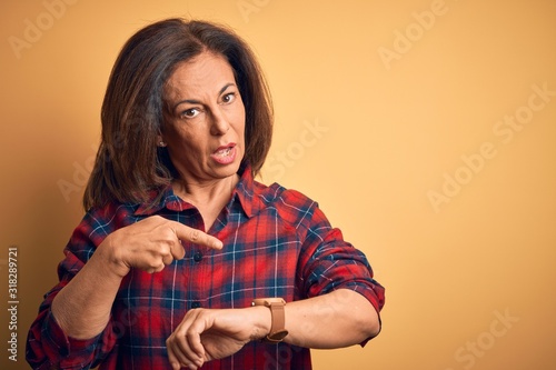 Middle age beautiful woman wearing casual shirt standing over isolated yellow background In hurry pointing to watch time, impatience, upset and angry for deadline delay