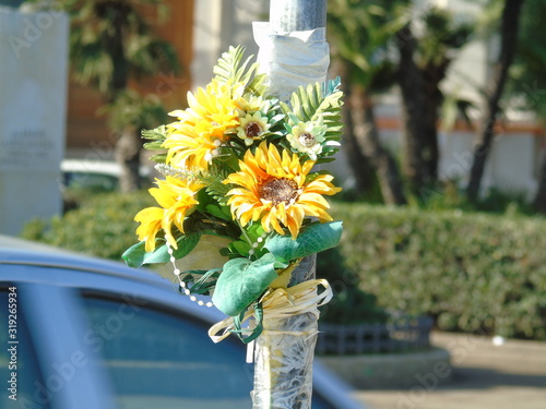 Fiori appesi al palo in memoria delle vittime della strada. Bari, sud Europa