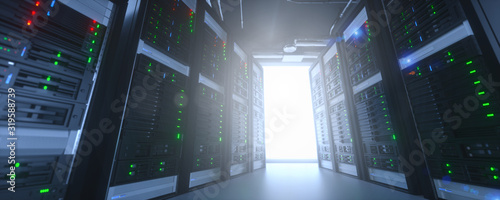 Server units in cloud service data center showing flickering light indicators for massive data connection bandwidth, close up shot.