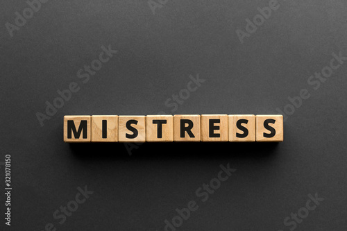 Mistress - words from wooden blocks with letters, mistress concept, top view gray background