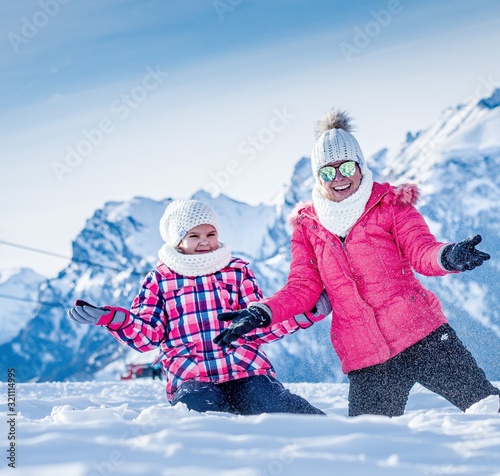 Zabawa z dzieckiem na sniegu w zimie we włoskich górach Dolomity na stoku narciarskim