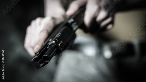 Man chambering a round in a .45 pistol. Close up with shallow depth of field.