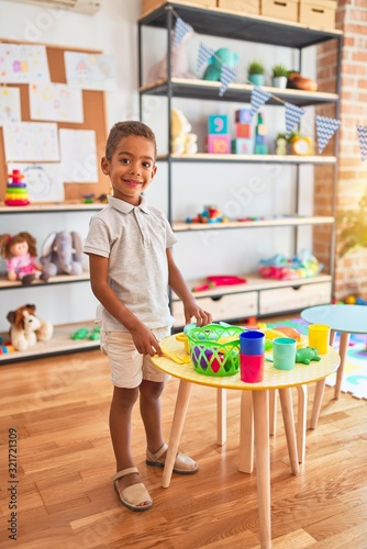 Beautiful african american toddler playing with plastic food and cutlery toy at kindergarten