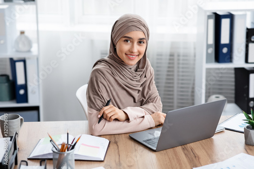 Millennial Muslim Girl In Headscarf Posing At Workplace In Modern Office