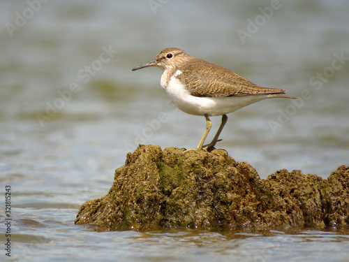 Common sandpiper (Actitis hypoleucos), documentary photo of wader bird in natural habitat searching for food in shallow water at the river Drava shore