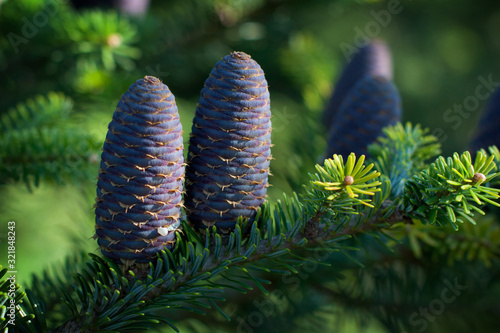 Fir cones are deployed to the top of the branch. Close up Photo . Abies sibirica young cones. Nature background
