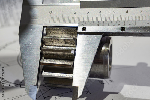 A vernier caliper measures the length of a gear tooth lying on a technical drawing, industry and engineering.