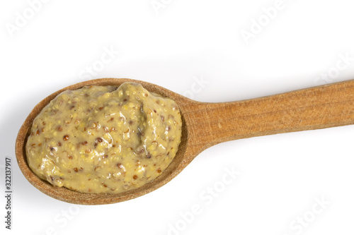 cuillère de moutarde à l'ancienne sur un fond blanc