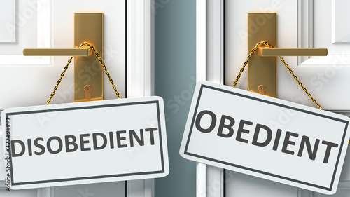 Disobedient or obedient as a choice in life - pictured as words Disobedient, obedient on doors to show that Disobedient and obedient are different options to choose from, 3d illustration