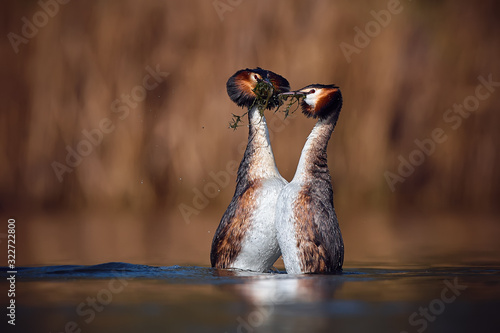 Wedding dance of Great Crested Grebe - Podiceps cristatus. Spring photo of water birds. Wildlife scene from Czech Republic. Animals in natural environment.