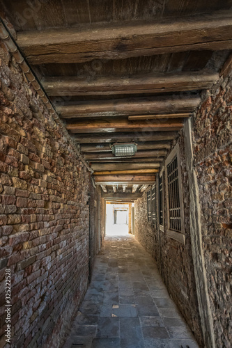 VENICE, ITALY - August 03, 2019: Narrow pedestrian streets of Venice bitween the channels. Some quiet places almost without people