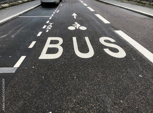 Photo d'une voie de circulation réservée aux bus et vélos en gris et blanc avec emplacement de stationnement pour taxi