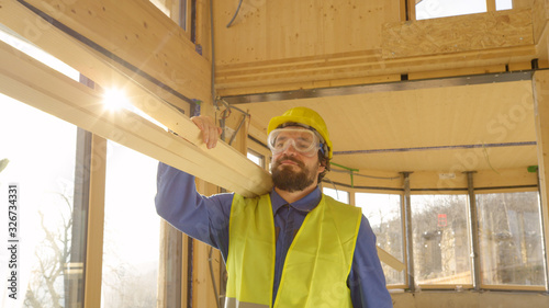CLOSE UP: Worker arrives to work carrying heavy wooden beams on his shoulder