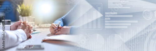 Business negotiation between businesswoman and businessman, light effect; panoramic banner