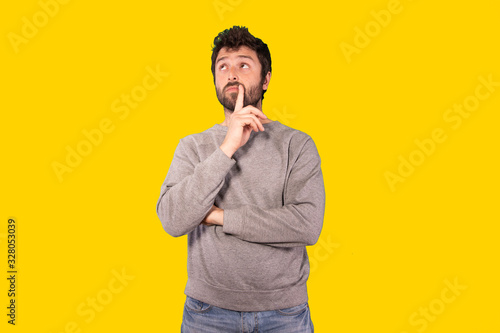 young handsome man thinking, feeling doubtful and confused, with different options, wondering which decision to make over yellow background