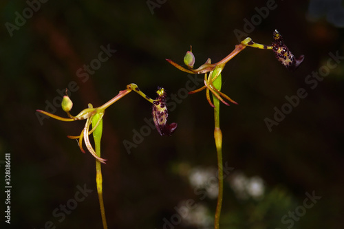 Two flowers of the rare Warty Hammer Orchid, Drakaea livida, an endemic orchid species growing in spring in Southwest Western Australia
