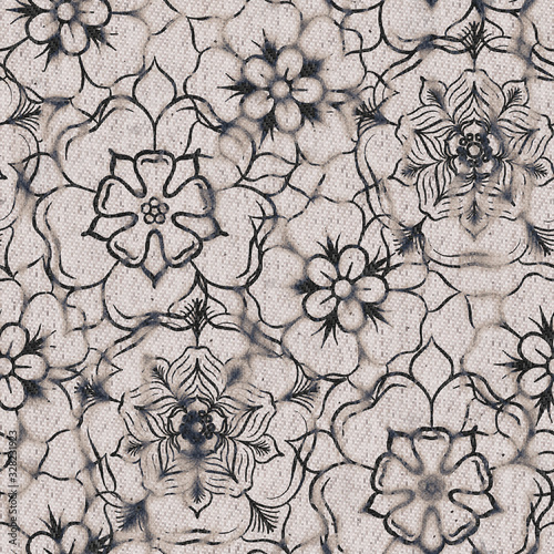 Seaumless neutral worn faded western white denim jean texture with tudor rose floral pattern overlay. Intricate mottled grungy seamless repeat raster jpg pattern swatch.