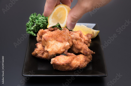 鶏の唐揚げにレモンをかける男性の手元