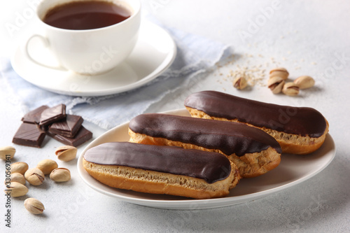 Dessert. Eclairs with chocolate glaze with a cup of coffee. Cake with cream. Chocolate, pistachios on a light background. Background image, copy space