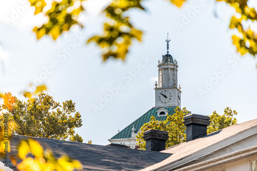 Hot Springs, VA historic downtown city in Virginia countryside closeup of autumn tree leaves framing tower of old building architecture