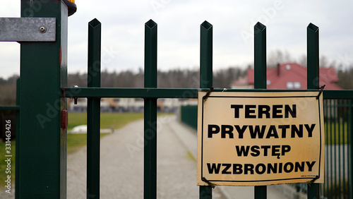 Tabliczka informacyjna, znak informacyjny na bramie wjazdowej na osiedle mieszkaniowe, napis "teren prywatny, wstęp wzbroniony". Osiedle zamknięte, strzeżone, ogrodzone.