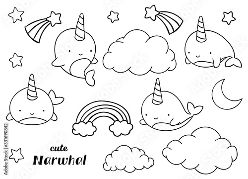 Coloring pages, black and white, set cute kawaii hand drawn narwhal doodles