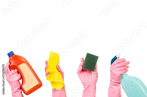Manos con guantes de látex rosa sosteniendo productos de limpieza, botella, esponja, paño sobre un fondo blanco liso y aislado. Vista de frente. Copy space. Concepto: Limpieza