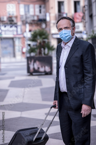Uomo di mezza eta vestito in giacca indossa un mascherina azzurra cammina con il suo trolley
