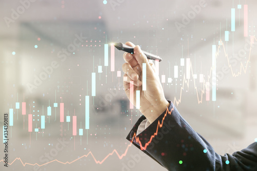 Double exposure of man hand with pen working with abstract creative financial chart hologram on blurred office background, research and strategy concept