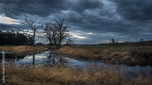 Krajobraz z drzewami i pochmurnym niebem przed burzą