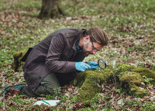 Absorbed botanist in rubber gloves collecting and studying moss samples using tweezers and magnifier