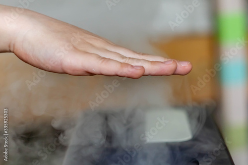 Humidifying the air in the house with a humidifier. White steam from the water. The atmosphere in the room.