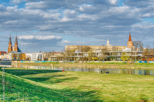 panorama Opola od strony rzeki Odry, wiosna nad rzeką, widok na amfiteatr zasłonięty drzewami, słoneczna wiosenna pogoda, spacery wzdłuż rzeki