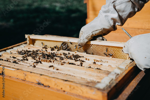 The beekeeper holds a honey cell with bees in his hands. Apiculture. Apiary